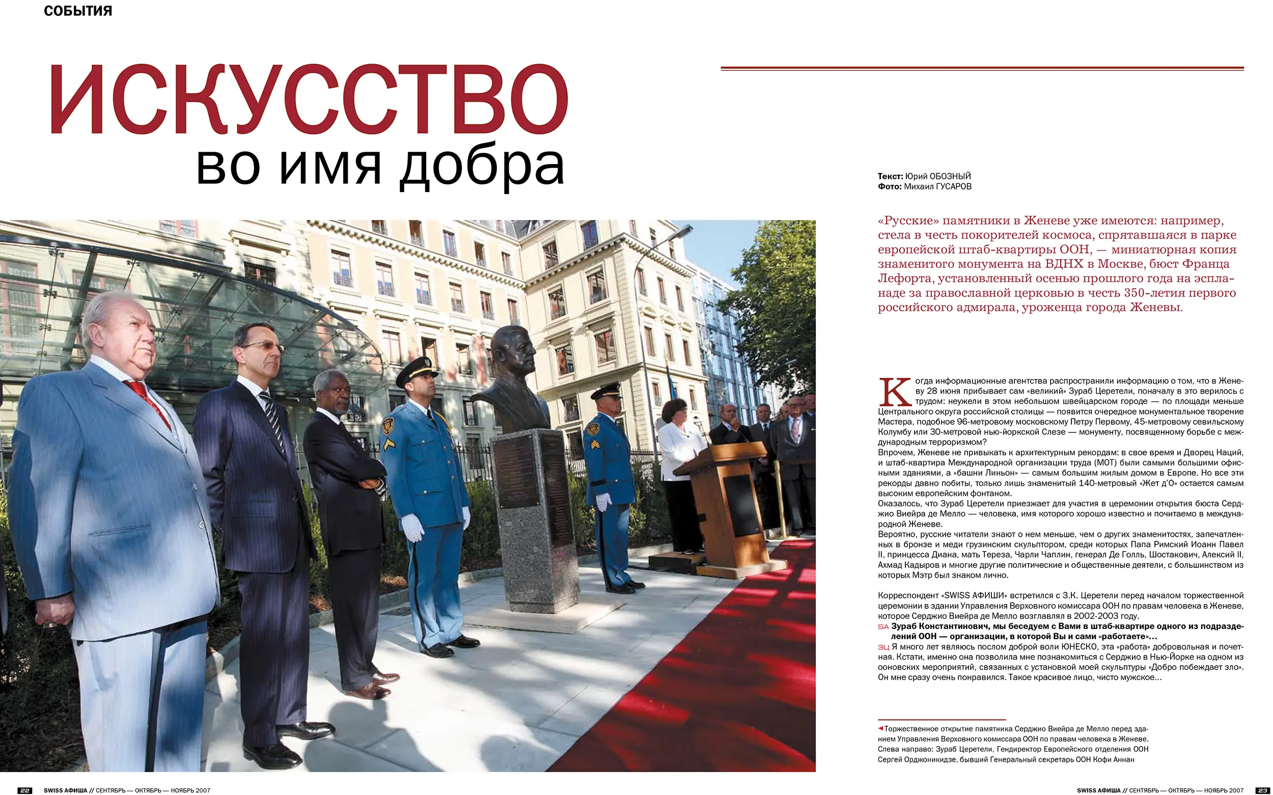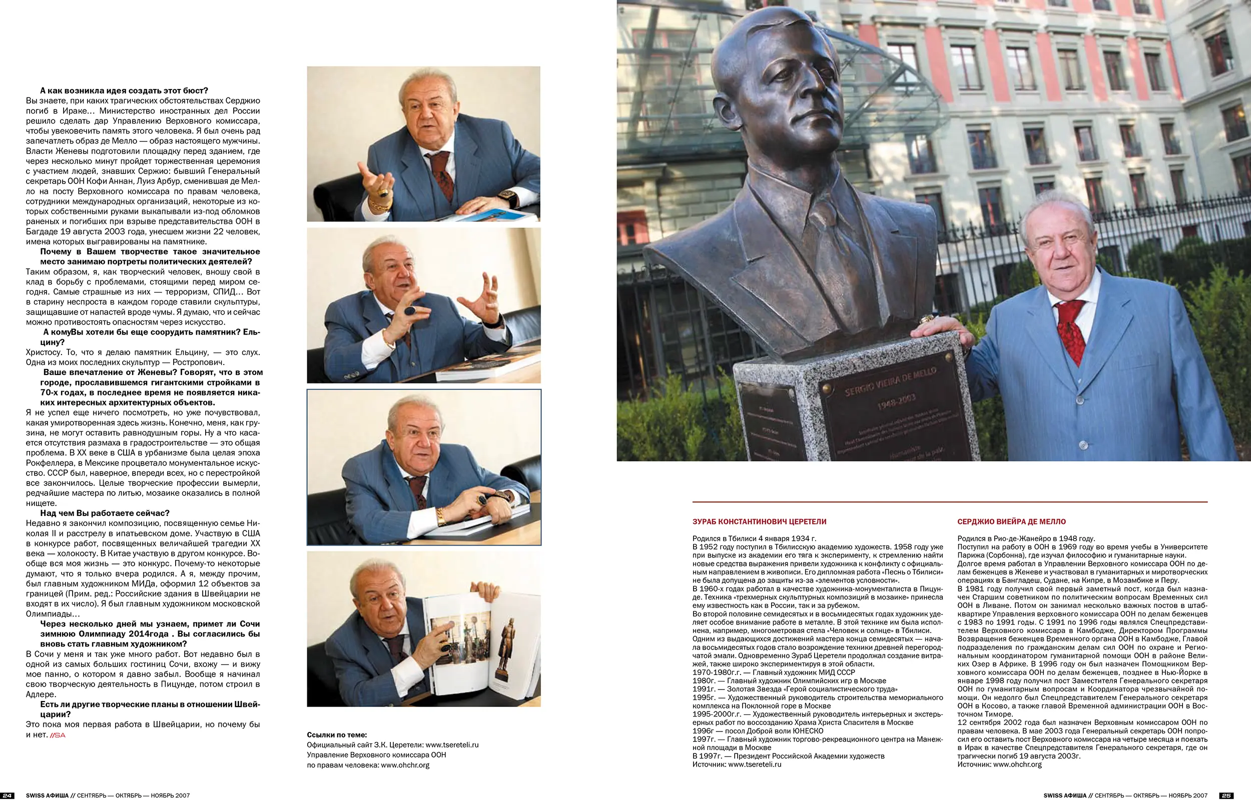 В 2007 году корреспонденту журнала «Swiss Афиша» удалось пообщаться с Зурабом Церетели во время торжественной церемонии открытия памятника Серджио Виейра де Мелло.